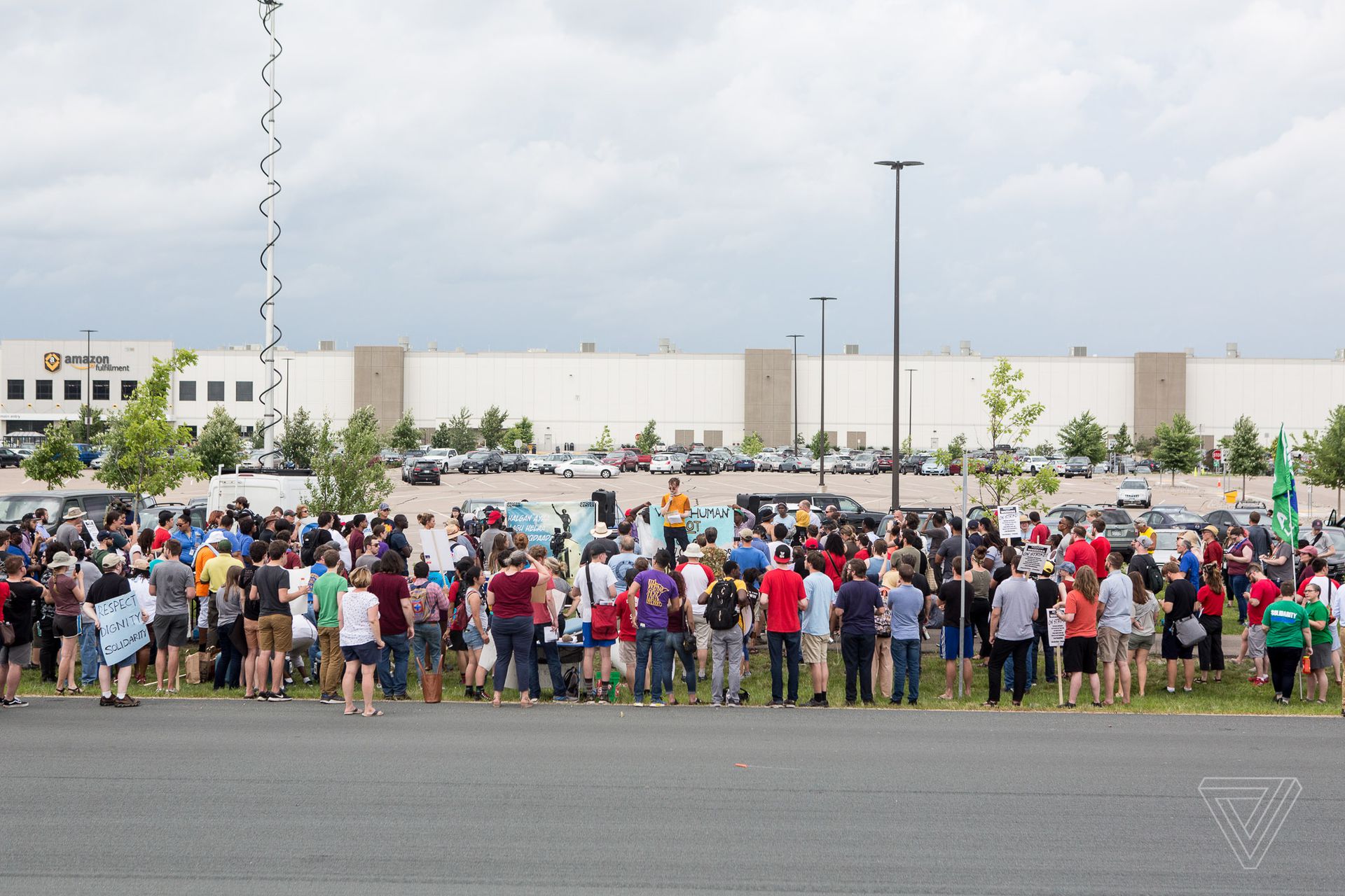 Amazon worker appearing in front of warehouse speaking about employer retaliation.